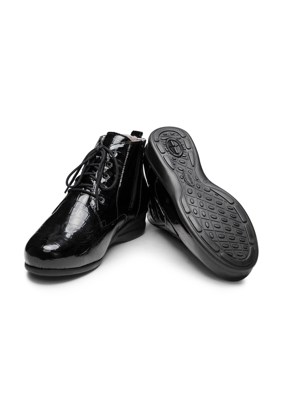 Kroko und Lack im Kuschelstil? Geht denn sowas? Na klar! Mit dieser wunderhübschen Stiefelette von VITAFORM haben wir den allzeit beliebten Kroko-Look kombiniert mit einer eleganten Lackoptik und das Ganze haben wir noch mit feinstem Lammfell gefüttert. Kombiniert haben wir hier gewohnt qualitativ hochwertiges Leder mit einem Stretchmaterial, damit das Kroko auch schön an Ihre Füße passt. Schon haben Sie Ihren neuen Winterliebling! Dank der schön schlicht gehaltenen Schnürsenkel sticht der Kroko-Stil schön hervor, egal ob in dezentem schwarz, oder gemütlichem auberginefarben. Hinzu kommt natürlich unser Shock-Absorber im betonten VITAFORM Retrolook um dieser Kroko-Stiefelette die unglaubliche VITAFORM Bequemlichkeit zu spendieren. Damit laufen Sie wie auf Wolken und sehen auch noch total schick aus!