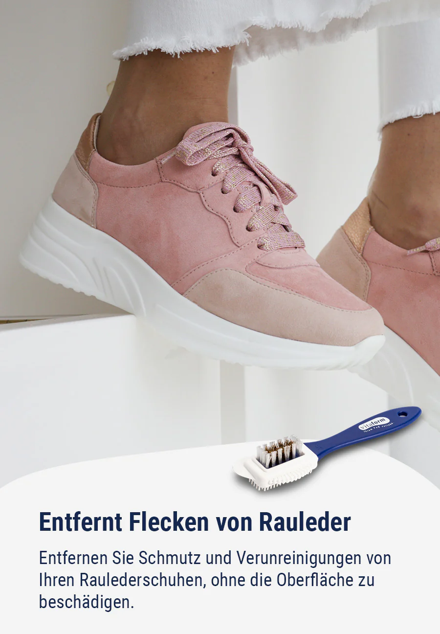 Geben Sie Ihren Schuhen eine reinigende Extra-Streicheleinheit! Um feine Raulederarten wie Nubuk-, Velours- oder Samtziegenleder erneut blitzeblank zu kriegen, sind Raulederbürsten ein unverzichtbares Tool. Tiefsitzender Schmutz kann mit den Messingbürsten vorsichtig herausgebürstet werden. Die flexiblen, weißen Borsten sorgen für ein besseres und kinderleichtes abbürsten von Schmutz.