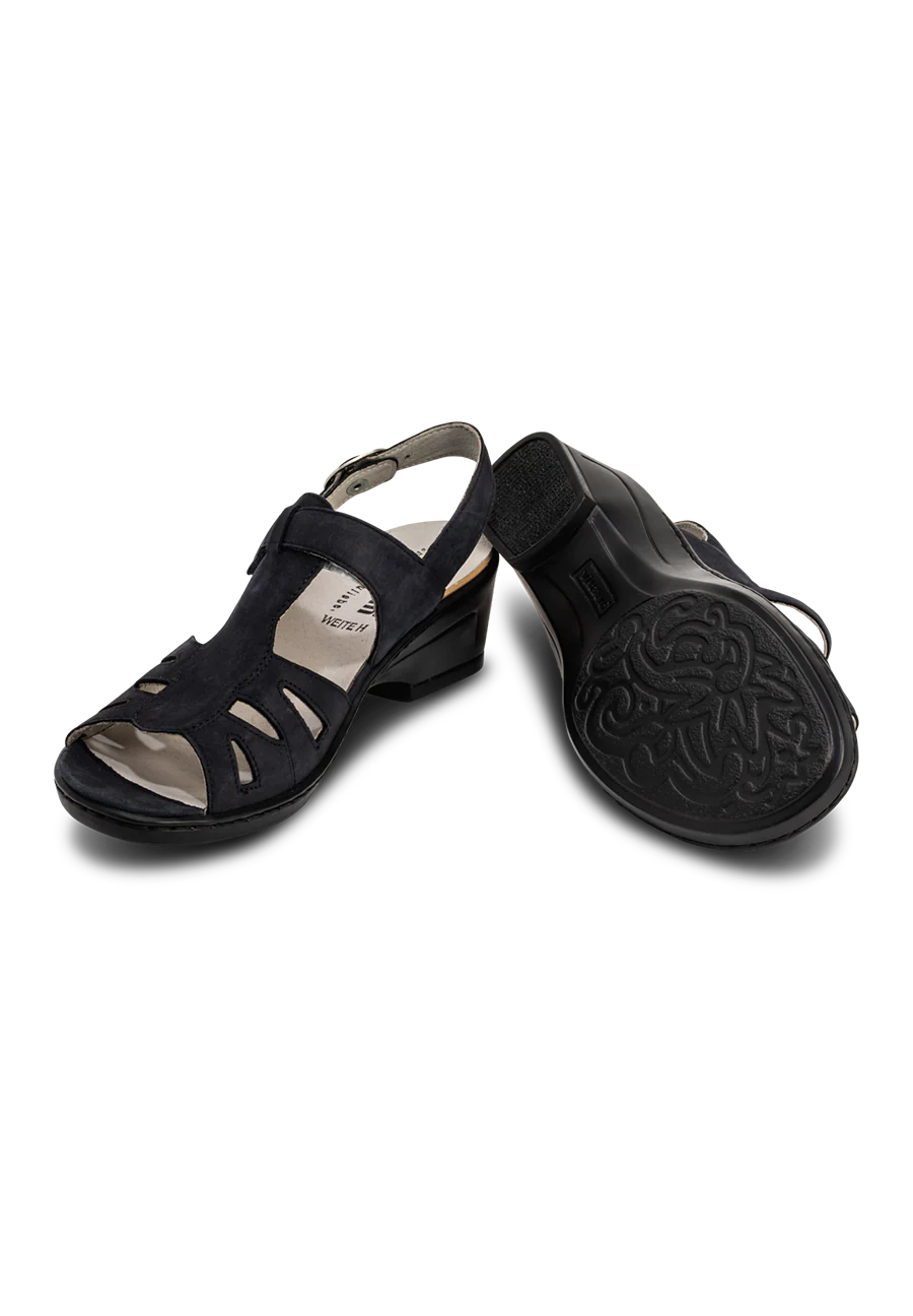 Der Heißhunger auf Sommer ist groß: High-Comfort-Gigant vitaform sorgt mal wieder für eine 1A Abhilfe und stillt alle schuhhungrigen Mäuler mit der sommerlich-schönen Sandalette aus wunderbar-geschmeidigem Nubukleder in einem tiefblauen Marineton, so endlos wie die Weiten des Ozean. Das atmungsaktive Lederfutter sorgt selbst bei besonders heißen Temperaturen für frische Füße, während die komfortable Premium-Innenausstattung, mit integriertem Luftpolsterfußbett, das Sommerglück perfekt macht.